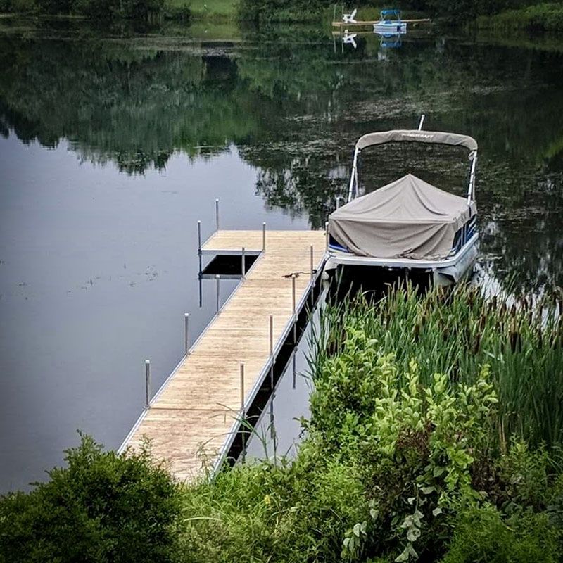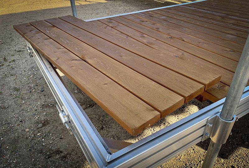 Les accessoires sont en aluminium et fixés avec de la quincaillerie en inox et les supports à poteaux sont fixes aux 4 coins de la structure. Diverses unions sont disponibles (en triangle, en « C » ou en « L ») pour pouvoir configurer le quai à votre discrétion, en ligne droite, en « T » ou encore en « L ».