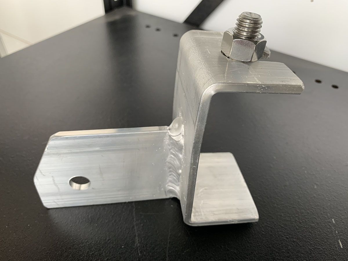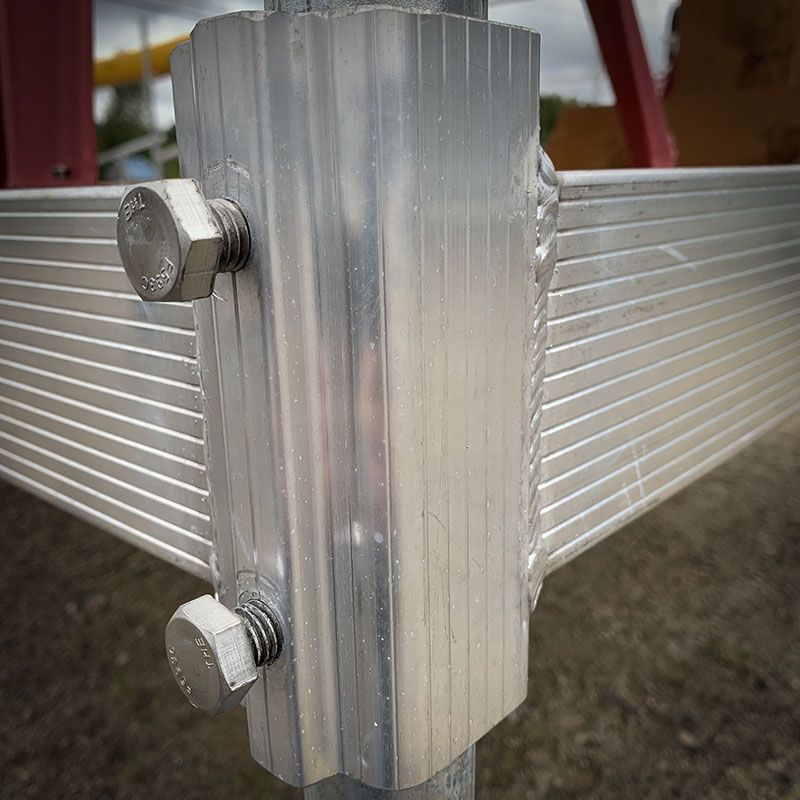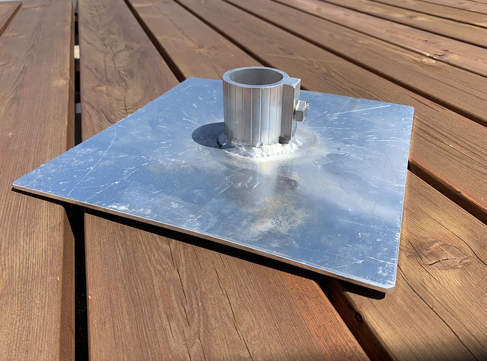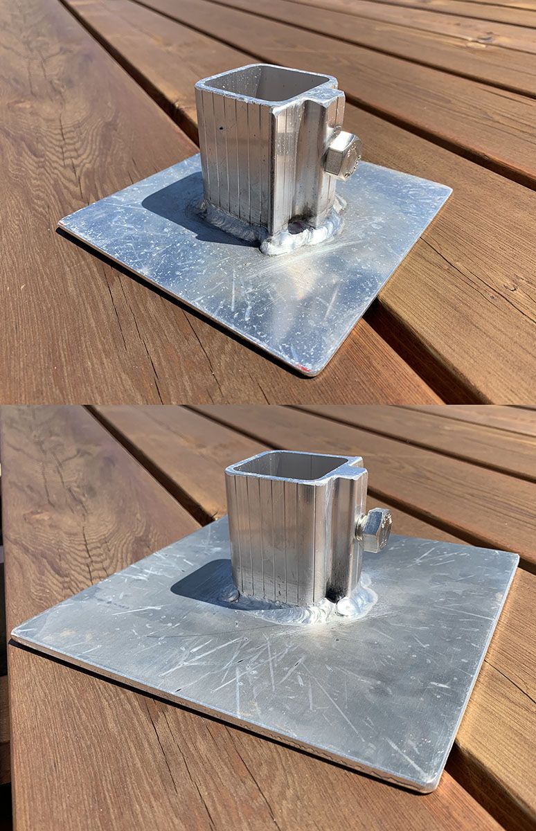 Les plaques de fond en aluminium ont 6’’ x 6’’, d’une épaisseur de 1/8. Dépendant le type de sol, il est également possible d’opter pour des plaques de fond en aluminium de 8’’ x 8’’, toujours d’une épaisseur de 1/8. Nous utilisons des poteaux en acier galvanisé d’un diamètre de 1-5/8” de grave « navy », c’est-à-dire avec un mur intérieur de .140.